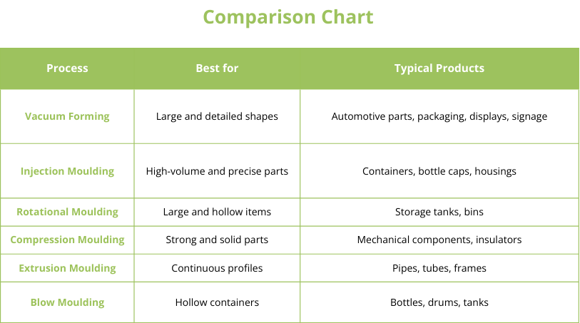 Some of the most popular types of plastic moulding consist of vacuum forming, injection moulding, rotational moulding, compression moulding, extrusion moulding and blow moulding. In this article, we will take you through each type of plastic moulding, their purposes and what makes them unique.